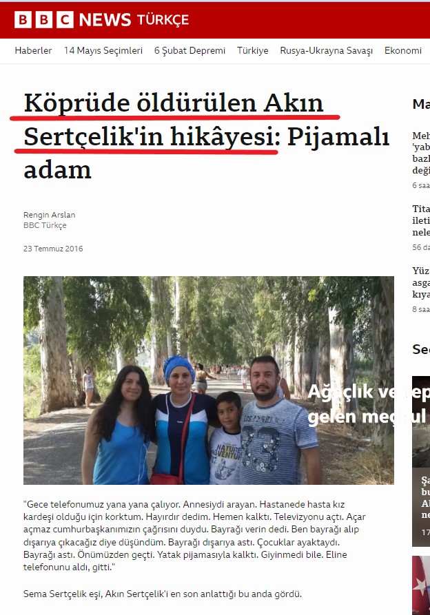 41 yaşında ve Taksicilik yapan Akın Sertçelik, evli ve iki çocuk babasıydı. Akın Sertçelik’in , Boğaziçi Köprüsünde sözde darbeci askerlerin açtığı ateş sonucu vefat ettiği iddia edilmektedir. Ancak resmi raporlar çok farklı bir sonucu ortaya koydu.