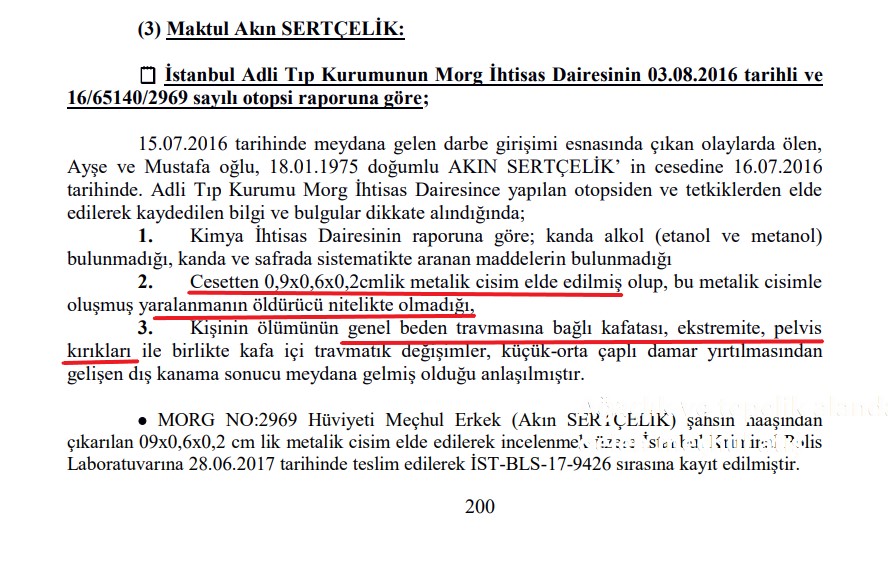 Aşağıda maktule ilişkin otopsi raporunun görselini görmekteyiz. İddia halkın üzerine ateş açıldığı şeklinde ifade edilmekteydi. Oysa maktulün vücudunda mermi giriş ve mermi çıkış deliklerinin, mermi yolunun bulunmadığı rapordan anlaşılmaktadır. Vücuttan bir metalik cisim çıkarıldığı ifade edilse de ölümün buna bağlı olmadığı belirtilmektedir. Ölümün genel beden travmasına bağlı kafatası kırıkları kaynaklı olduğu ifade edilmektedir. Ortada sert cisimle vurma, kafa üstü düşme veya araç kazası gibi ihtimaller belirmektedir. Köprüdeki asker ile vatandaş arasında yaklaşık 300 m mesafe varken askerin maktulü darp etmesi, tankla ezmesi veya bir yerden düşürmesi gibi bir ihtimal bulunmamaktadır. Hangi askerin hangi eylemi sonucu ölümün vuku bulduğuna dair kamera görüntüsü, uzmanlık raporları gibi belgeler olmaksızın ölümün köprüdeki askere yüklenmesi hukuk katliamıdır. Her türlü şüpheden uzak bir şekilde bu ortaya konamadığı sürece ortada bir faili meçhul olduğunu kabul etmek gerekir.