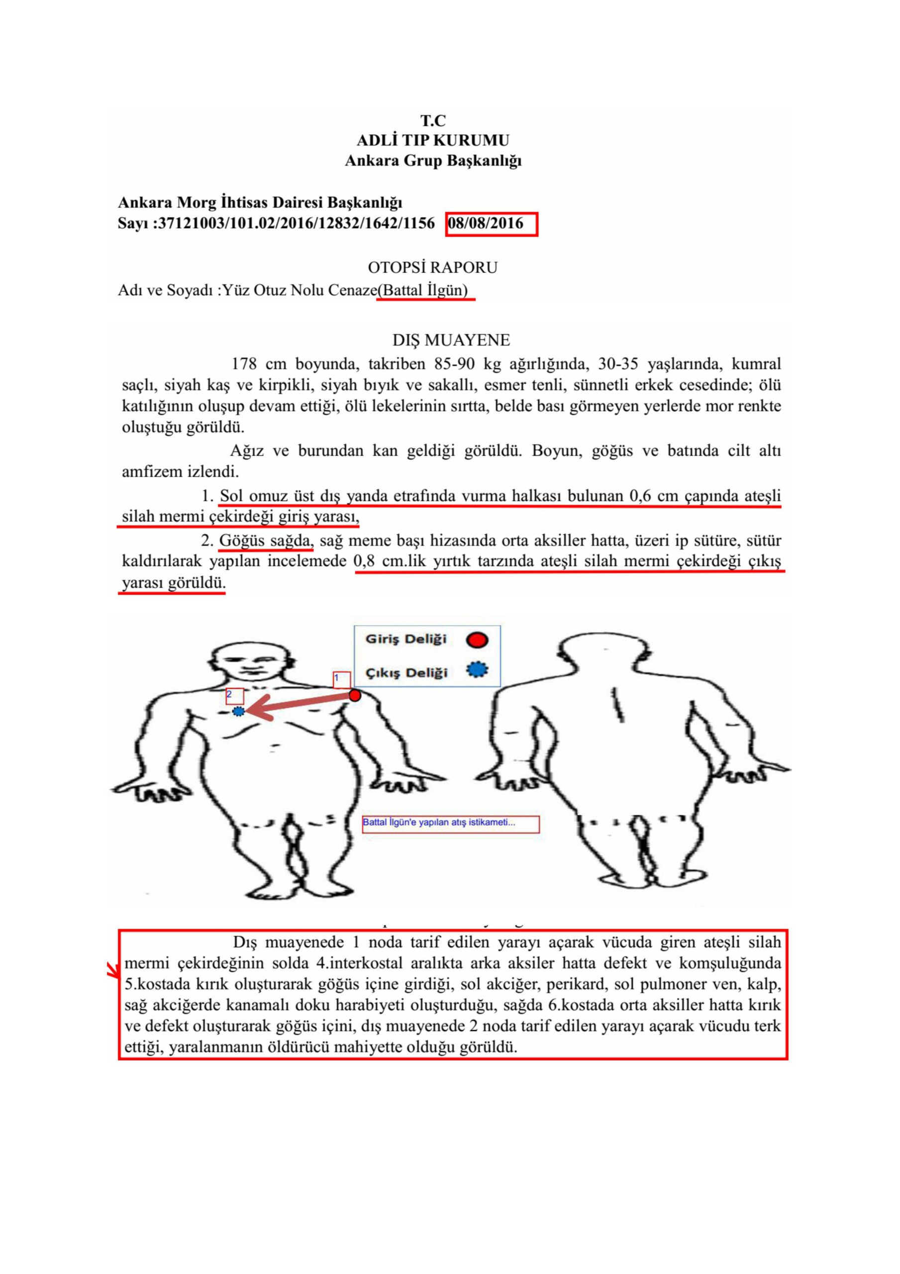 Belgeye göre Battal İlgün’ün vücudunda kalan mermi çekirdeği olmamakla birlikte: Kullanılan mühimmatın 5.56 mm çapında olduğu anlaşılmaktadır. Bu çapta mühimmat, Türk Silahlı Kuvvetleri ve Emniyet birimleri envanterinde bulunan silahlarda kullanılmaktadır. Ancak o gün Jandarma Genel K.lığındaki askeri personelde bu silahın olup olmadığı ve kullanılıp kullanılmadığı araştırılmamış ve toplanan silahlardan da hiç biri bu vakada ki mermi çekirdeği ile örtüşmemektedir.