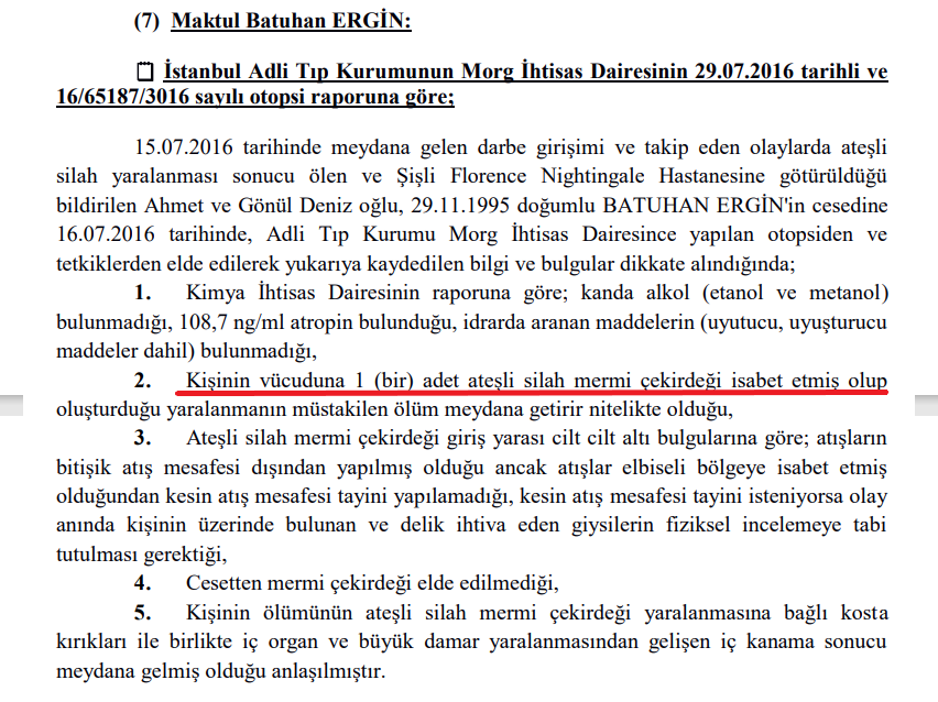 Maktul Batuhan Ergin’in aşağıda görseli yer alan otopsi raporu incelendiğinde tek atış ve tek kurşunla vurulduğu anlaşılmaktadır. Bu tek atışın köprüyü kapatan asker tarafından yapıldığı ve bu atış sonucu maktulün şehit olduğu, savcının iddiası ve mahkemenin kabulü olarak karşımıza çıkmaktadır. İzleyen bölümde nitelik gerektiren bu TEK atışın köprüyü kapatan asker tarafından neden yapılamayacağını ortaya koymaya çalışacağız. Mahkemenin bilirkişi görevlendirerek yapması gereken ancak yapmaktan geri durduğu araştırmayı sizlere sunacağız. Sosyal medyada hak mücadelesine devam eden ve seçkin güvenlik birimlerinde görev yapmış uzmanlarımızın verdiği katkı, ölümler konusunda askerin masumiyetini ortaya çıkarmış olacaktır.