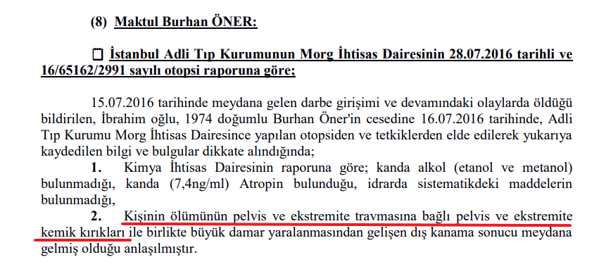 SONUÇ: Otopsi raporu maktulün ölümüyle sanıklar arasında bağın kurulamayacağını açık bir şekilde ortaya koymaktadır. Ancak her 15 Temmuz yıldönümünde 251 ölüme vurgu yapılarak, şüpheli ölümlerin bile askere yüklenerek yakınlarının linç ediliyor olması anlaşılabilir değildir