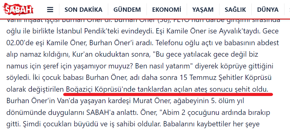 Ayrıca Savcılık Boğaz köprüsünde yapılan 4 tank atışına ilişkin görüntüleri iddianameye koymuştur. Tank mermilerinin çoğunun boş alana doğru atıldığı bu görüntülerden anlaşılmaktadır. Birçok 15 Temmuz yargılamasında tahrip olan yerler iddianameye konduğu gibi boy boy rejim medyasında kendine yer bulmuştur. Köprüde tank atışının oluşturduğu tahribata ve atış bölgesine dair görüntülere resmi belgelerde yer verilmemesi düşündürücüdür. Bununla beraber, aşağıda yer alan görselde, rejim medyası niteliğinde bazı ulusal yayın organlarının gerçeği araştırmadan maktulün ölümüyle ilgili insafsızca haberler yaptığı ve bu haberlerin bir iftiraya dönüştüğü çok açık bir şekilde görülmektedir.