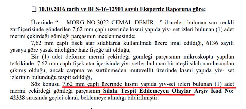 İstanbul Kriminal Laboratuvarınca Cemal Demir’in vücudundan çıkarılan 7.62 çapındaki mermi çekirdeğinde kısmi yapıda yiv-set izleri bulunmuş. Aşağıda yer alan kriminal raporunda şok bir gerçek var. Silahın kullanan fail bulunamamış ve olay resmi olarak Silahı Bulunamayan Olaylar Arşivine kayıt olunmuş. Yani anlamı şu; askerin elindeki silahlarla deneme atışı yapılmış ve çekirdekte oluşan izler maktulün vücudundan çıkan çekirdekle kıyaslanmış, çekirdeğin askere ait bir silahtan atılmadığı ortaya çıkmış ve başka olaylardan ele geçmesi muhtemel silahlarla kıyaslanmak üzere beklemeye alınmış. Köprüdeki askerin silahlarına başkaca inceleme yapılmayacağını ve Merkez Komutanlığına teslim edildiğini de hatırlatalım.