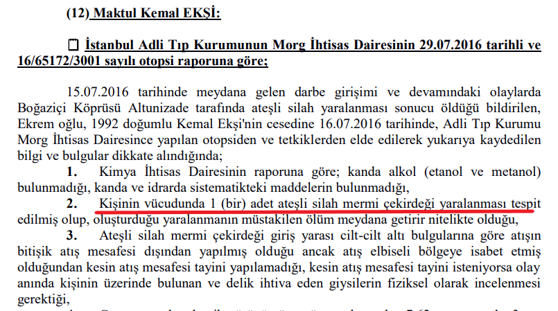 Maktul Kemal Ekşi’nin aşağıda görseli yer alan otopsi raporu incelendiğinde tek atış ve tek kurşunla vurulduğu anlaşılmaktadır. Bu tek atışın köprüyü kapatan asker tarafından yapıldığı ve bu atış sonucu maktulün şehit olduğu, savcının iddiası ve mahkemenin kabulü olarak karşımıza çıkmaktadır. İzleyen bölümde nitelik gerektiren bu TEK atışın köprüyü kapatan asker tarafından neden yapılamayacağını ortaya koymaya çalışacağız. Mahkemenin bilirkişi görevlendirerek yapması gereken ancak yapmaktan geri durduğu araştırmayı sizlere sunacağız. Sosyal medyada hak mücadelesine devam eden ve seçkin güvenlik birimlerinde görev yapmış uzmanlarımızın verdiği katkı, ölümler konusunda askerin masumiyetini ortaya çıkarmış olacaktır.