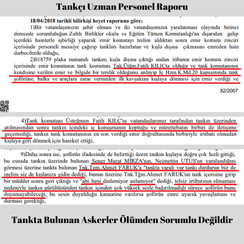Yaşanan olayda Ütğm.Fatih Mehmet KILIÇ Tank Komutanı, Tğm.Ahmet Faruk ÇAVUŞ Doldurucu, Uzman Çvş.Harun BULUT Nişancı ve Uzman Çvş.Burak ÇAKIR Şoför olarak görev yapmaktaydı. Kışladan çıkışları saldırıya uğrayan askeri tesislere destek amacıyla olmuştur. Polis ve halkla karşı karşıya kalınca şiddete başvurmadan kışlalarına geri dönmüşlerdir. Dönüş yolunda Tank Komutanı Ütğm.Fatih Mehmet KILIÇ galeyana gelmiş halk tarafından tanktan atılmış ve darp edilmiştir. Komutayı Tğm.Ahmet Faruk ÇAVUŞ almış ve tankın üzerine çıkan vatandaşlarla beraber tank yol almaya başlamıştır. Tank talimnamelerine göre Tank Komutanının araca komuta etmesini engelleyen kişiler tankın verdiği zarardan birinci dereceden sorumludur. Kendilerini tehdit etmediği ve zor kullanmadığı halde kışlasına dönmeye çalışan tank komutanını linç eden ve darp edenler yaşanan ölümden sorumludur. Ayrıca aşağıdaki görselde yer alan Tankçı Uzman Personelin hazırladığı Bilirkişi raporu da askerlerin ölümden sorumlu olamayacağını açıkça ortaya koymaktadır.