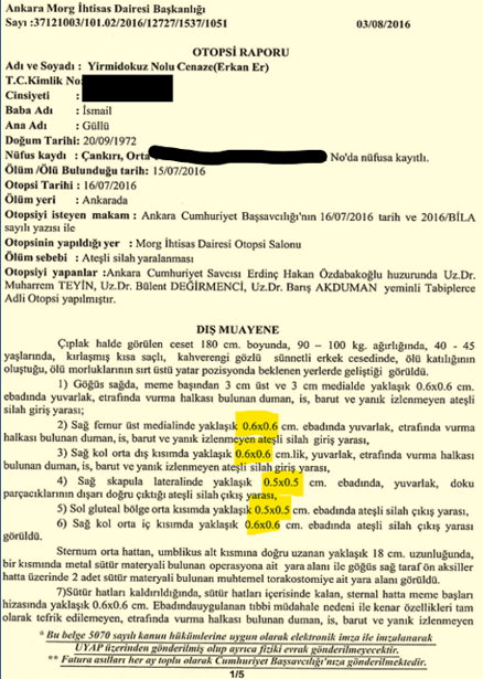 Bununla birlikte otopsi raporunda ölüme sebebiyet veren atışın sağ meme üstünden girip sağ kürek kemiğinin kenarından çıkan bir atış olduğu anlaşılmaktadır. Aşağıdaki temsili resim kamera görüntülerinden hareketle yaklaşık olarak maktulün duruş açısını göstermektedir. Mermi giriş ve çıkışını işaretlediğimiz okun yönüne bakarsak atışın Cumhurbaşkanlığı yerleşkesinden geldiği bilgisini teyit etmiş oluruz.