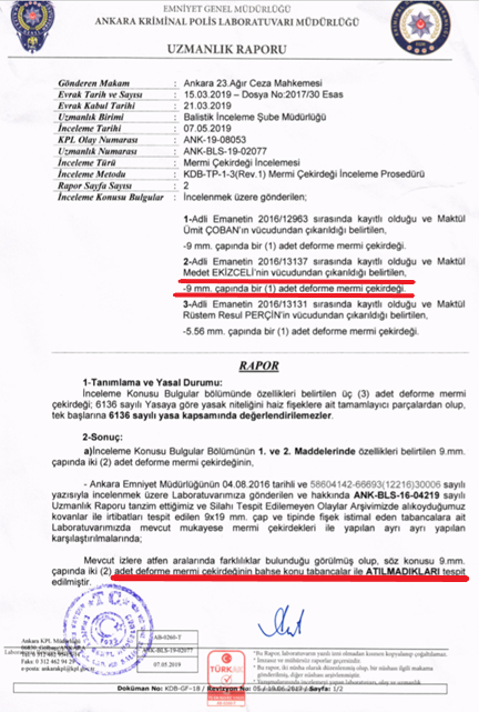 Ankara Kriminal Polis Laboratuvarının Uzmanlık raporunda maktul Medet Ekizceli’nin vücudundan 9 mm deforme mermi çekirdeğinin çıkarıldığı ifade edilmiştir. Hemen akla sanıkların elindeki silahların da 9 mm mermi attığı akla gelmektedir. Ancak yine aynı uzmanlık raporunda maktulün vücudundan çıkan mermi çekirdeğinin sanıkların silahından atılmadığı ifade edilerek sanıklar aklanmıştır.