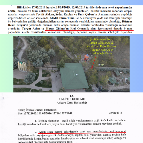 Buna ek olarak aşağıda görseli yer alan otopsi raporunda maktulün uzak atış neticesinde vefat ettiği ve mermi çekirdeğinin vücudunu delip geçtiği ifade edilmektedir. Oysa savcı ve bilirkişilerin iddiası görseldeki depoda yakın atış neticesinde başından vurulduğu yönündedir. Otopsi raporu net olarak ortaya koymaktadır ki maktul uzak atış sonucu ölmüştür ve sanığa yüklenen infaz suçu temelsizdir. Ayrıca sanık infaz niyetindeyse neden uzaktan atış yapmayı tercih etsin veya gözaltındaki diğer şahısları neden infaz etmesin.