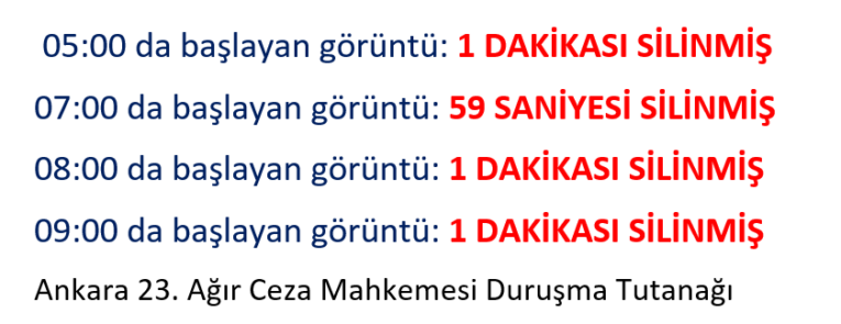 Savcılığın ilk iddiası, kameralarda maktulün sanık tarafından infaza götürüldüğü yönündedir. Burada kamera incelemelerini yapan bilirkişinin delillerle oynadığına dair çok önemli bir iddia mevcuttur. Bilirkişiler ham kamera görüntüleri üzerinde bazı silmeler yaparak oluşturdukları CD’yi mahkemeye ve sanıklara sunmuştur. Teslim edilen CD görüntülerinde MAUS imlecinin hareket etmesi bunun fiyasko olduğunu teyit eden önemli bir ayrıntıdır. Muhtemelen ham verilerde yer alan infaz anı görüntüsü başka faili işaret ettiği için böyle bir yol izlenmiştir. Sanığın mahkemedeki ısrarlı taleplerine rağmen ham kamera görüntülerinin kendisine verilmemesi tam bir hukuk katliamıdır. Aşağıda duruşma tutanağından hareketle hazırlanan silme bilgilerini görmektesiniz.