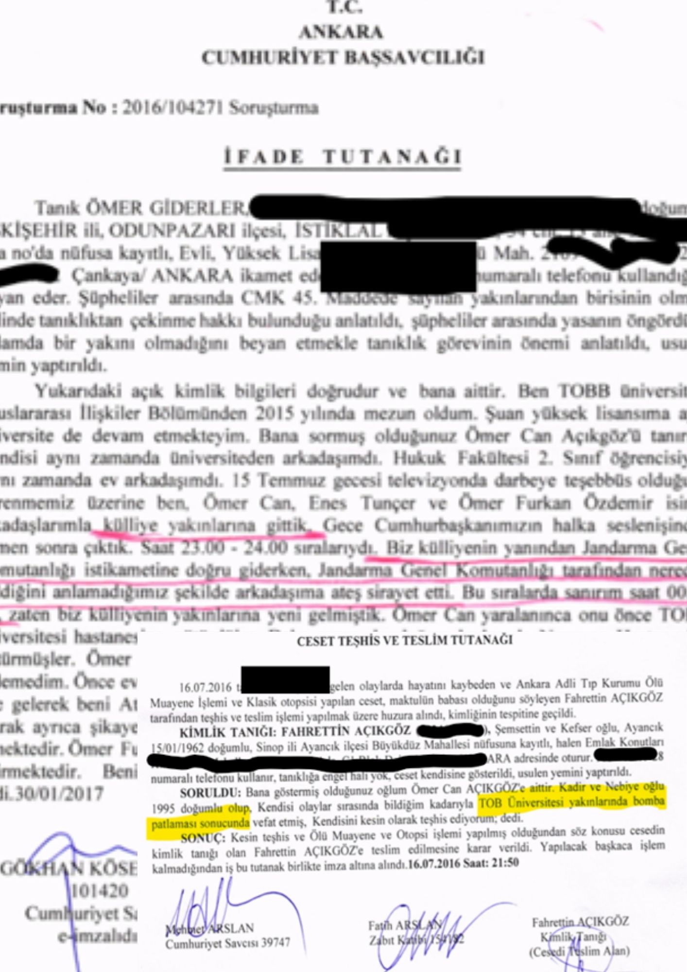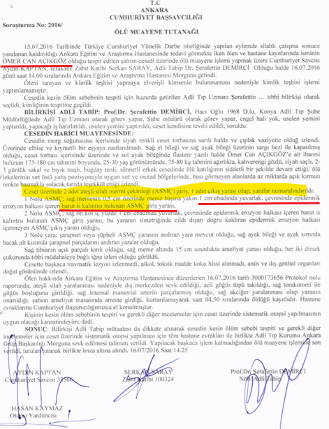 Babası Fahrettin Açıkgöz tarafından yapılan ceset teşhisi sonucu düzenlenen tutanakta TOBB Üniversitesi yakınlarında uçaktan atılan bomba sonucu öldüğü ifade edilmiştir. Aynı zamanda maktulün arkadaşı olan tanık Ömer Giderler ise aşağıda yer alan ifadesinde o gece Cumhurbaşkanlığı külliyesi civarında olduklarını ifade etmiştir. Devamında JGK tarafından tam olarak nereden geldiğini bilemediğimiz bir atış sonucu şehit oldu demiştir. Görüldüğü gibi bulunduğu yer veya ölüm sebebiyle ilgili karmakarışık bilgilerin bulunması, her türlü şüpheden uzak bir şekilde failin asker olduğu tezini kabul etmemizi imkansız kılmaktadır. Diğer delillerde bu bilgiyi teyit etmektedir.
