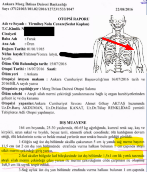 Kamera görüntüsüyle birlikte en önemli delil otopsi raporu. Otopsi raporunda mermi girişinin sağ üst meme başı civarından, mermi çıkışının ise sol kol bileşkesine yakın bir bölgeden olduğu ifade edilmektedir. Bu tarife göre mermi yolunu aşağıda örnek resim üzerinde görmek mümkündür. Kamera görüntüsüne tekrar baktığımızda vurulma esnasında maktulün yüzünün karşıya baktığını anlıyoruz. Tüm bu bilgileri birleştirdiğimizde maktulün jandarma karargahının ters istikametinden vurulduğu net bir biçimde ortaya çıkıyor.
