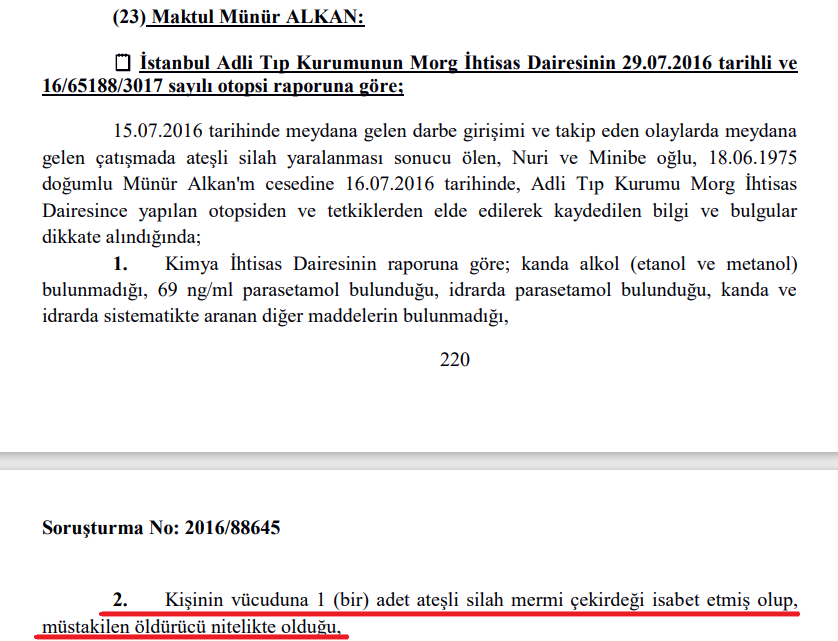 SONUÇ: Bu deliller Münür Alkan’ı vuranın asker olmadığını resmi belgelerle ortaya koyduğu gibi maktulün muhtemel konumu, gece görüşü şartları, atışı imkansız kılan uzun mesafe gibi şartlar başkaca faillerin bulunduğunu ortaya koymaktadır.