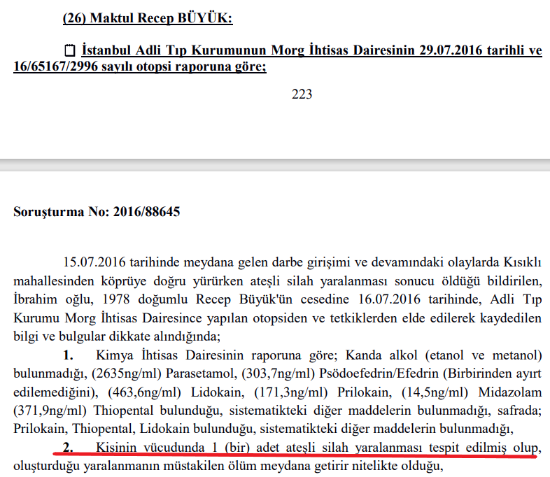 Maktul Recep Büyük’ün aşağıda görseli yer alan otopsi raporu incelendiğinde tek atış ve tek kurşunla vurulduğu anlaşılmaktadır. Bu tek atışın köprüyü kapatan asker tarafından yapıldığı ve bu atış sonucu maktulün şehit olduğu, savcının iddiası ve mahkemenin kabulü olarak karşımıza çıkmaktadır. İzleyen bölümde nitelik gerektiren bu TEK atışın köprüyü kapatan asker tarafından neden yapılamayacağını ortaya koymaya çalışacağız. Mahkemenin bilirkişi görevlendirerek yapması gereken ancak yapmaktan geri durduğu araştırmayı sizlere sunacağız. Sosyal medyada hak mücadelesine devam eden ve seçkin güvenlik birimlerinde görev yapmış uzmanlarımızın verdiği katkı, ölümler konusunda askerin masumiyetini ortaya çıkarmış olacaktır.