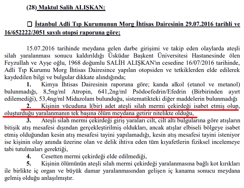 Maktul Salih Alışkan’ın aşağıda görseli yer alan otopsi raporu incelendiğinde tek atış ve tek kurşunla vurulduğu anlaşılmaktadır. Bu tek atışın köprüyü kapatan asker tarafından yapıldığı ve bu atış sonucu maktulün şehit olduğu, savcının iddiası ve mahkemenin kabulü olarak karşımıza çıkmaktadır. İzleyen bölümde nitelik gerektiren bu TEK atışın köprüyü kapatan asker tarafından neden yapılamayacağını ortaya koymaya çalışacağız. Mahkemenin bilirkişi görevlendirerek yapması gereken ancak yapmaktan geri durduğu araştırmayı sizlere sunacağız. Sosyal medyada hak mücadelesine devam eden ve seçkin güvenlik birimlerinde görev yapmış uzmanlarımızın verdiği katkı, ölümler konusunda askerin masumiyetini ortaya çıkarmış olacaktır.
