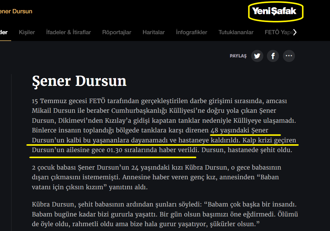 Aşağıda Yeni Şafak gazetesinde yer alan görselde maktulün askerlerin eylemleri neticesinde öldüğü ve darbe şehidi olduğu gibi bir yazı yer almaktadır. Bu yazı aslında sorumluluğun askere yüklenemeyeceğinin itirafı niteliğindedir. Çünkü ölümün; sebep sonuç ilişkisi bakımından ”darbe” niyetiyle hareket eden şahısların silahla ateş etme, bombalama, tankla ezme gibi eylemleri sonucunda olması beklenir. Oysa burada ölümün doğal nedenler kaynaklı ve kalp krizi olduğu yer almıştır ve otopsi raporu bunu desteklemiştir. Yetkili yerel savcılık tarafından askerler aleyhine açılmış bir dava da bulunmamaktadır.