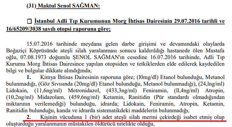 Maktul Şenol Sağman’ın aşağıda görseli yer alan otopsi raporu incelendiğinde tek atış ve tek kurşunla vurulduğu anlaşılmaktadır. Bu tek atışın köprüyü kapatan asker tarafından yapıldığı ve bu atış sonucu maktulün şehit olduğu, savcının iddiası ve mahkemenin kabulü olarak karşımıza çıkmaktadır. İzleyen bölümde nitelik gerektiren bu TEK atışın köprüyü kapatan asker tarafından neden yapılamayacağını ortaya koymaya çalışacağız. Mahkemenin bilirkişi görevlendirerek yapması gereken ancak yapmaktan geri durduğu araştırmayı sizlere sunacağız. Sosyal medyada hak mücadelesine devam eden ve seçkin güvenlik birimlerinde görev yapmış uzmanlarımızın verdiği katkı, ölümler konusunda askerin masumiyetini ortaya çıkarmış olacaktır.